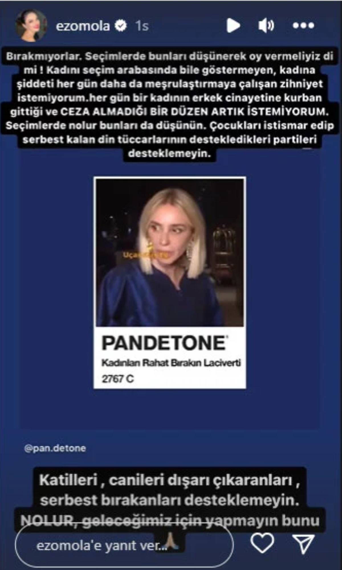 "Kadınları rahat bırakmıyorlar. Seçimlerde bunları düşünerek oy vermeliyiz değil mi! Kadını seçim arabasında bile göstermeyen, kadına şiddeti her gün daha da meşrulaştırmaya çalışan zihniyet istemiyorum. Her gün bir kadının erkek cinayetine kurban gittiği ve ceza almadığı bir düzen artık istemiyorum. Seçimlerde ne olur bunları da düşünün. Çocukları istismar edip serbest kalan din tüccarlarının destekledikleri partileri desteklemeyin. Katilleri, canileri dışarı çıkaranları, serbest bırakanları desteklemeyin. Ne olur geleceğimiz için yapmayın bunu."