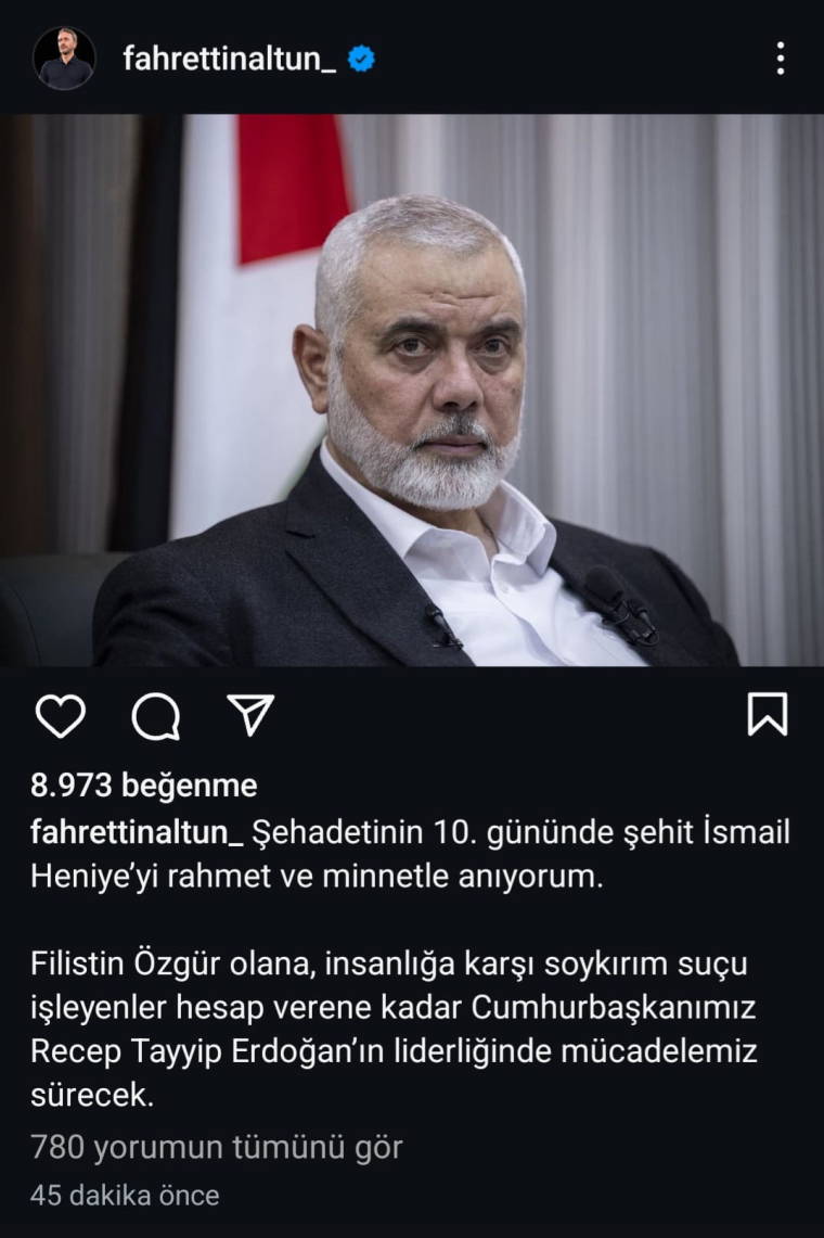 Altun, İran'da suikast sonucu öldürülen Hamas lideri İsmail Haniye için taziye paylaşımı yaptı.
