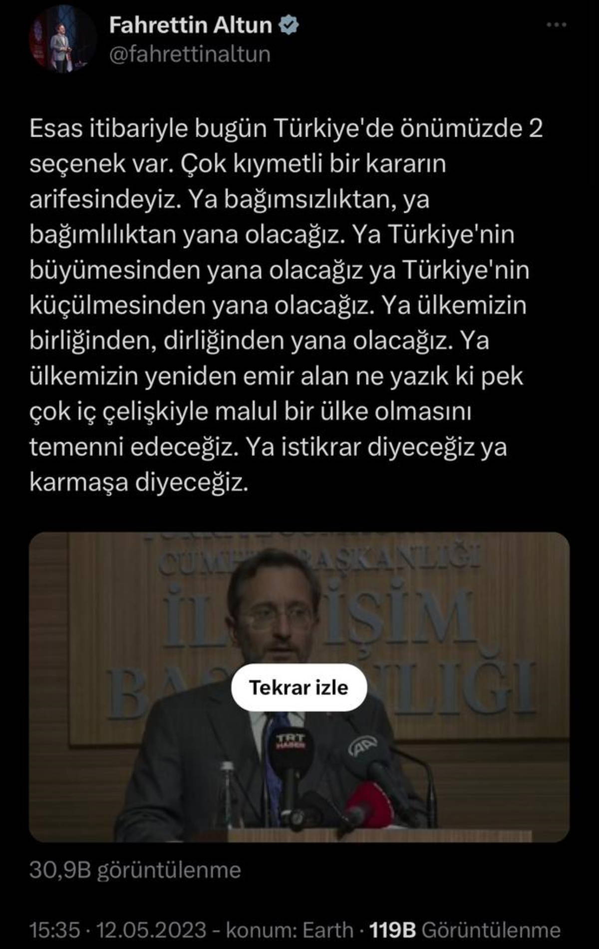 Türkiye, Cumhurbaşkanlığı ve 28. Dönem Milletvekili Seçimi için 48 saatten az bir süre sonra sandık başına gidecek. Seçime saatler kala, Cumhurbaşkanlığı İletişim Başkanı Fahrettin Altun'un sosyal medya hesabı Twitter'dan yaptığı provokatif paylaşım dikkat çekti. Altun, yaptığı paylaşımı 2 dakika sonra silip, aynı şekilde tekrar yükledi.