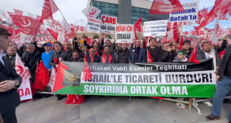 Yeniden Refah Partisi’nin İstanbul’daki mitinginde “İsrail’le Ticareti Durdur” pankartı, polis ekipleri müdahale etmesin diye protokolün hemen arkasında partililerce koruma altına alındı.