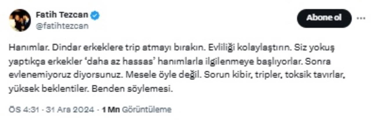 Tezcan, sosyal medya platformu X'teki (Twitter) hesabından yaptığı paylaşımda kadınlara "Hanımlar. Dindar erkeklere trip atmayı bırakın. Evliliği kolaylaştırın" diye seslenip şöyle yazdı: