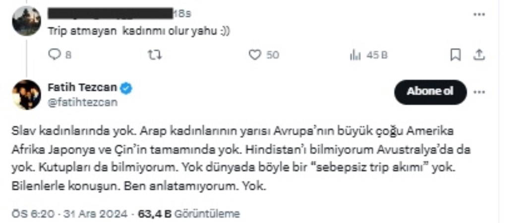 Tezcan paylaşımına bir takipçisinin "Trip atmayan kadın mı olur yahu?" diye yanıt vermesi üzerine de şu ifadeleri kullandı: