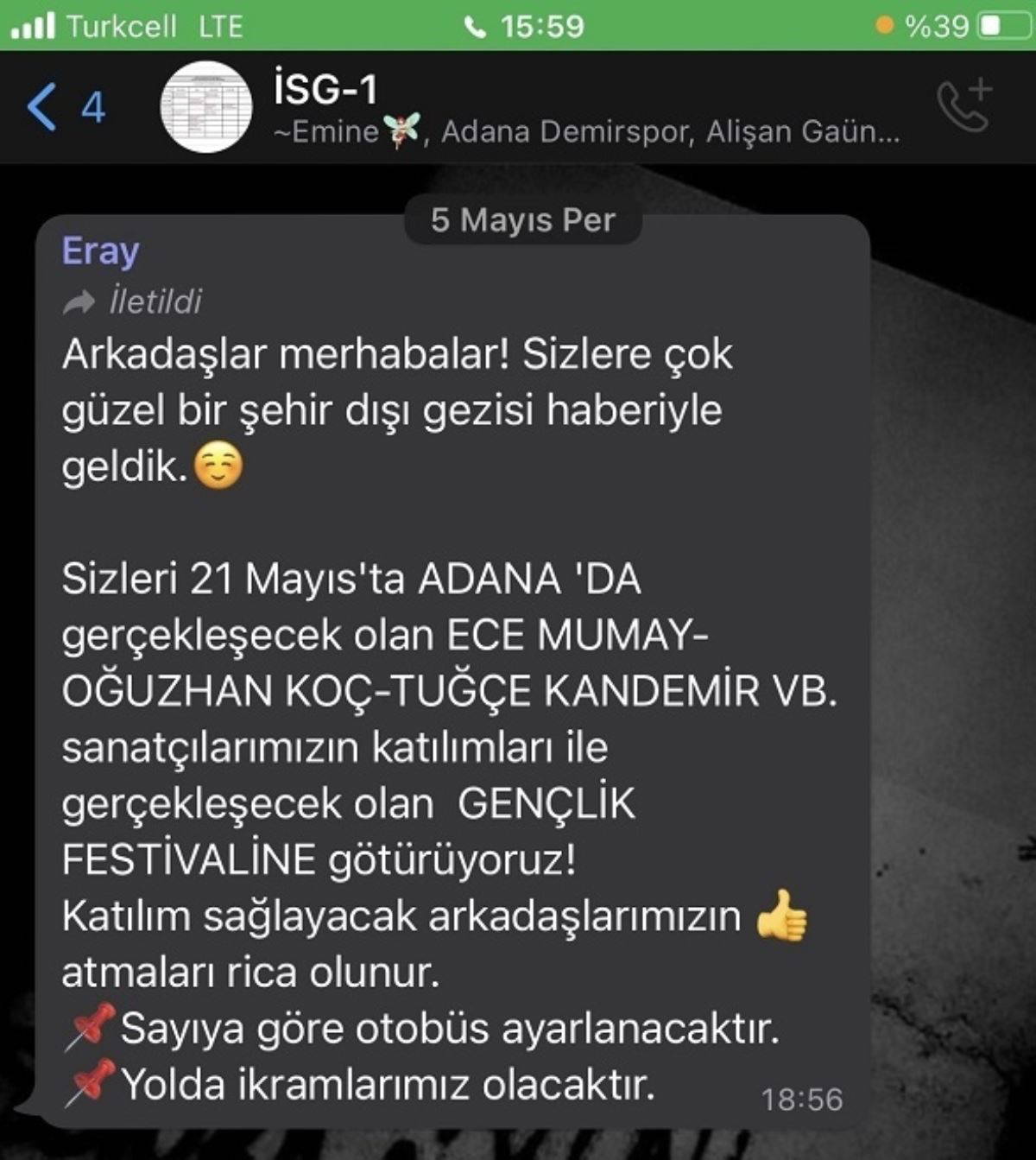 Öte yandan etkinliğin mesajları da ifşa edildi. Buna göre Türkiye'nin birçok ilinde öğrenci gruplarına "Adana'da gençlik festivaline götürüyoruz" diye mesaj atıldı. Festivalde Tuğçe Kandemir, Ece Mumay, Oğuzhan Koç ve Erdem Kınay'ın sahne alacağı belirtilen mesajlarda, etkinliğin AKP tarafından düzenlendiğine dair bir bilgi ise yer almadı.