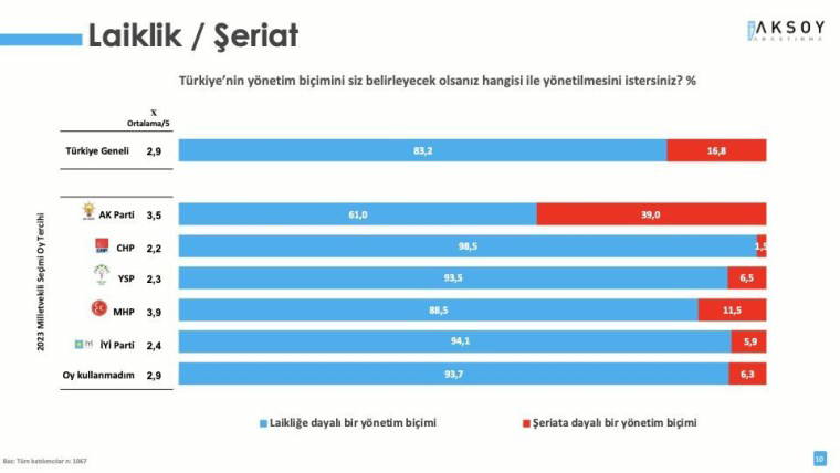 Ankete katılan seçmenlere, "Türkiye’nin yönetim biçimini siz belirleyecek olsanız hangisi ile yönetilmek istersiniz" sorusu soruldu. Laikliğe dayalı yönetim biçimi diyenlerin oranı yüzde 83,2 olurken, şeriata dayalı yönetim biçimi diyenlerin oranı yüzde 16, 8 olarak ölçüldü. Şeriat yönetimi isteyenlerin genel seçimde verdikleri oylara göre yapılan parti sıralaması ise şöyle oldu; AKP yüzde 39, MHP yüzde 11.5, YSP yüzde 6.5, İYİ Parti yüzde 5.9, CHP yüzde 1.5, seçimde oy kullanmayanlar: yüzde 6.3 Aksoy Araştırma’nın sahibi Ertan Aksoy anketi yüzde 95 güven aralığında yüzde 3 hata payıyla 1067 kişi ile gerçekleştirildiğini ifade etti.