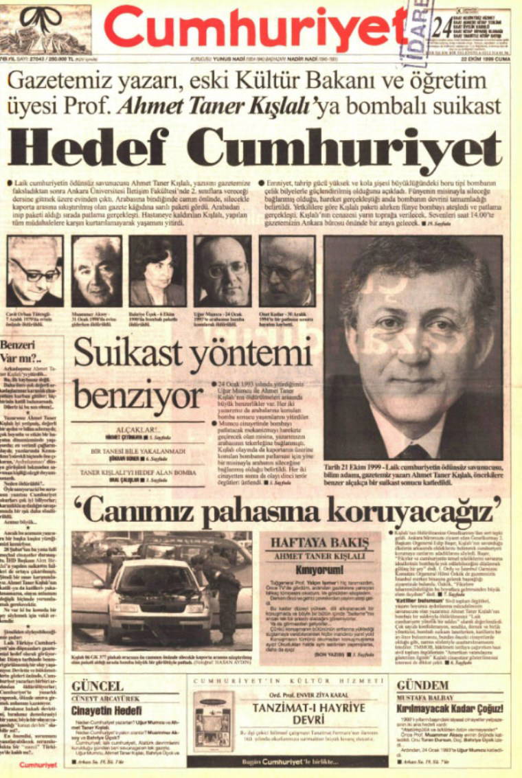 Prof. Dr. Ahmet Taner Kışlalı bombalı suikast sonucu 1999 yılında öldürüldü. Eski Kültür Bakanı, gazetemizin yazarı ve öğretim üyesi Prof. Dr. Ahmet Taner Kışlalı. “Aydın nedir” sorusunu “Aydın, kendini toplumundan sorumlu sayan insandır. Gerçeği arar” diye yanıtlayan Kışlalı, yazdığı gibi kendisini toplumdan sorumlu saydı ve gerçeği aradı