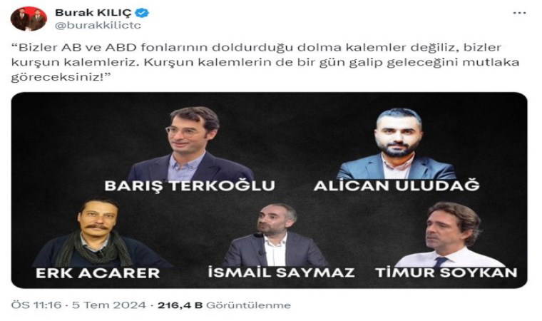 Dün, Burak Kılıç; gazeteciler Barış Terkoğlu, Alican Uludağ, Erk Acarer, İsmail Saymaz ve Timur Soykan'ı sosyal medyadan yaptığı, üzerinde gazetecilerin fotoğrafları ve isimleri bulunan görseli paylaşarak hedef gösterdi.