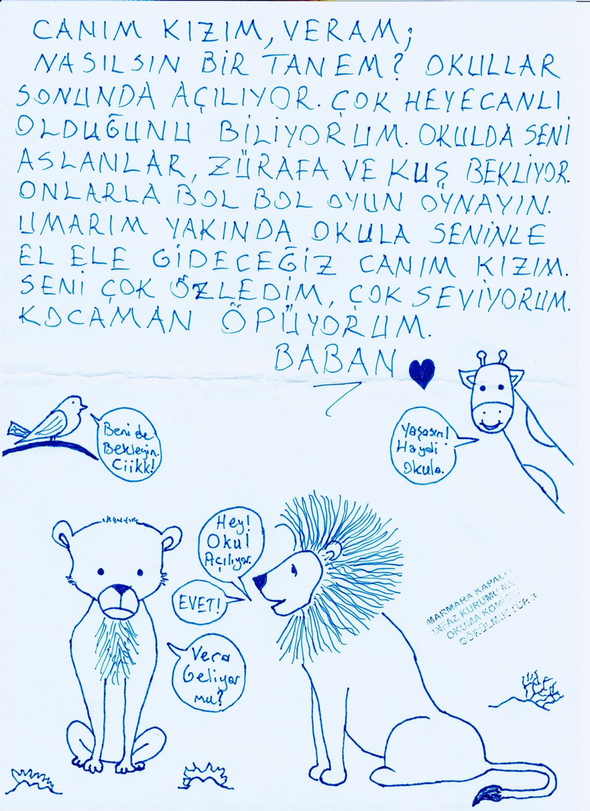 Tayfun Kahraman yazdığı mektuba aslan, kaplan ve zürafa resimleri çizerek “Canım kızım Veram. Okulda seni aslan, zürafa ve kuş bekliyor. Onlarla bol bol oyun oynayın. Umarım yakında okula seninle el ele gideceğiz. Canım kızım seni çok özledim, çok seviyorum” ifadelerini kullandı.