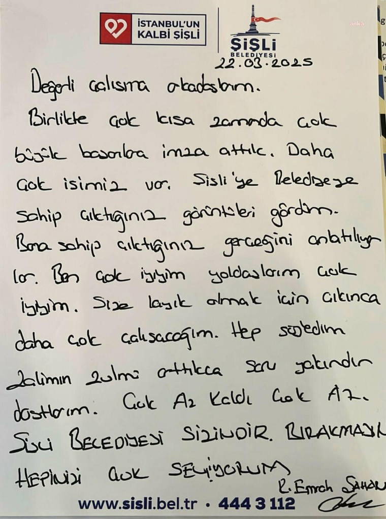 “Birlikte çok kısa zamanda çok büyük başarılara imza attık. Daha çok işimiz var. Şişli’ye Belediyeye sahip çıktığınız görüntüleri gördüm. Bana sahip çıktığınız gerçeğini anlatıyorlar. Ben çok iyiyim yoldaşlarım çok iyiyim. Size layık olmak için çıkınca daha çok çalışacağım. Hep söyledim zalimin zulmü arttıkça sonu yakındır dostlarım. Çok az kaldı çok az. Şişli Belediyesi sizindir, bırakmayın. Hepinizi çok seviyorum."