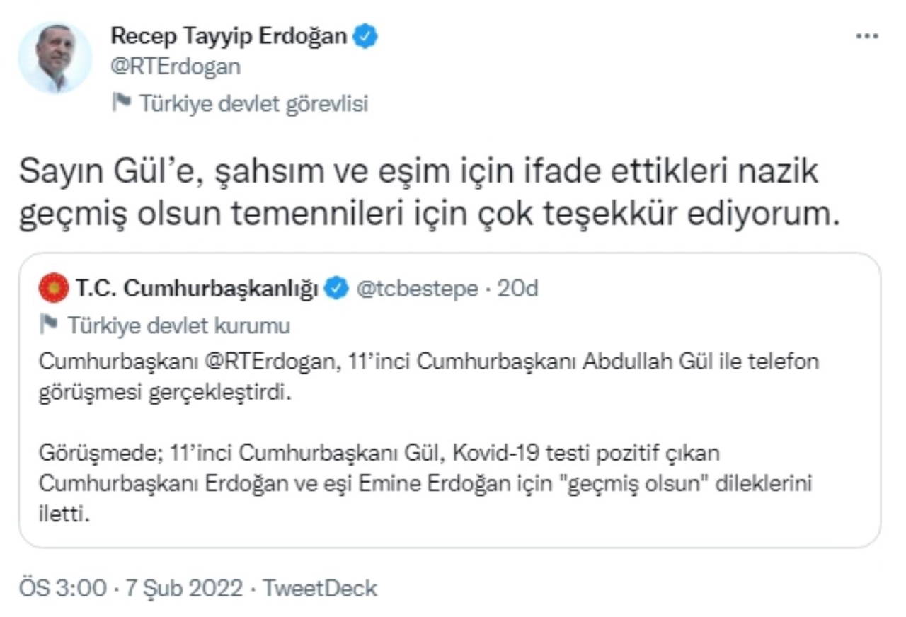 Cumhurbaşkanlığı sosyal medya hesabından görüşmeye ilişkin yapılan paylaşımda "Cumhurbaşkanı Recep Tayyip Erdoğan, 11’inci Cumhurbaşkanı Abdullah Gül ile telefon görüşmesi gerçekleştirdi. Görüşmede; 11’inci Cumhurbaşkanı Gül, Kovid-19 testi pozitif çıkan Cumhurbaşkanı Erdoğan ve eşi Emine Erdoğan için "geçmiş olsun" dileklerini iletti" denildi.