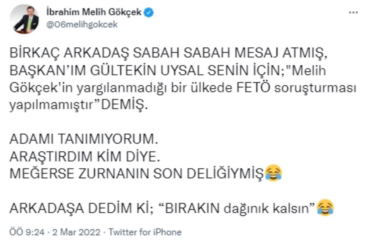 Gültekin Uysal'ın bu sözleri üzerine AKP'li Melih Gökçek sabah saatinde sosyal medya 'mesai'sine başladı. Gökçek, konuya dair Twitter üzerinden takipçilerine "açıklama" yaparak "Birkaç arkadaş sabah sabah mesaj atmış, Başkanım Gültekin Uysal senin için 'Melih Gökçek'in yargılanmadığı bir ülkede FETÖ soruşturması yapılmamıştır” demiş. Adamı tanımıyorum. Araştırdım kim diye. Meğerse zurnanın son deliğiymiş" ifadelerini kullandı.