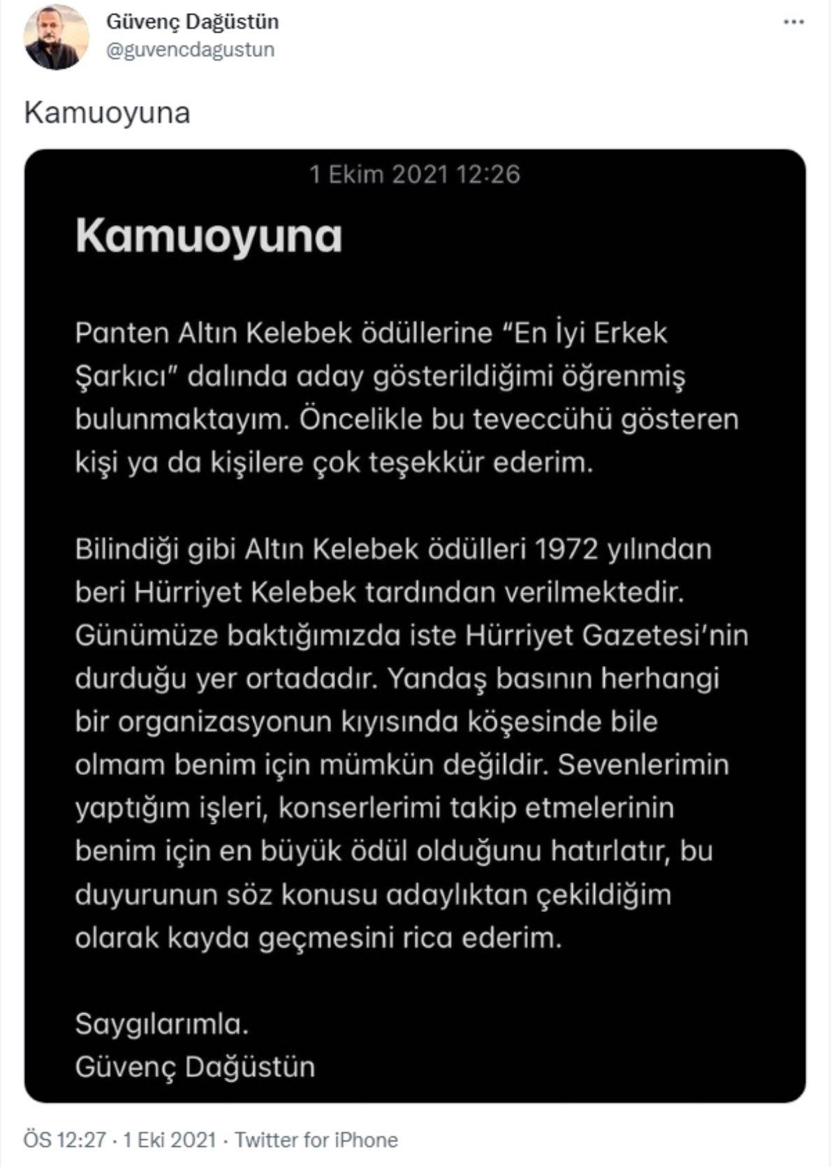 Bilindiği gibi, Altın Kelebek ödülleri 1972 yılından beri Hürriyet Kelebek tarafından verilmektedir. Günümüzde baktığımızda ise Hürriyet Gazetesi'nin durduğu yer ortadadır. Yandaş basının herhangi bir organizasyonunun kıyısında köşesinde bile olmam benim için mümkün değildir. Sevenlerimizin yaptığım işleri, konserlerimiz takip etmelerinin benim için en büyük ödül olduğunu hatırlatır, bu duyurunun söz konusu adaylıktan çekildiğim olarak kayda geçmesini rica ederim.
