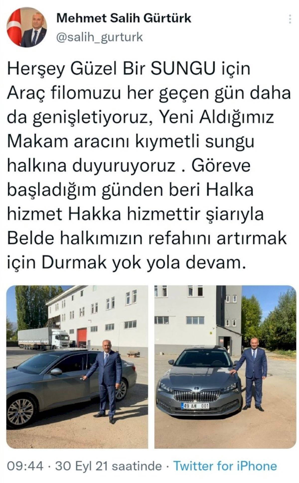 AKP'li Sungu Belediye Başkanı Mehmet Salih Gürtürk, özel sipariş ettiği aracıyla çekildiği fotoğrafı Twitter hesabından "Yeni aldığımız makam aracını kıymetli Sungu halkına sunuyoruz. Göreve başladığım günden beri 'Halka hizmet Hakka hizmettir' şiarıyla belde halkımızın refahını artırmak için durmak yok yola devam" sözleriyle paylaştı. Gürtürk, daha sonra paylaşımını sildi.