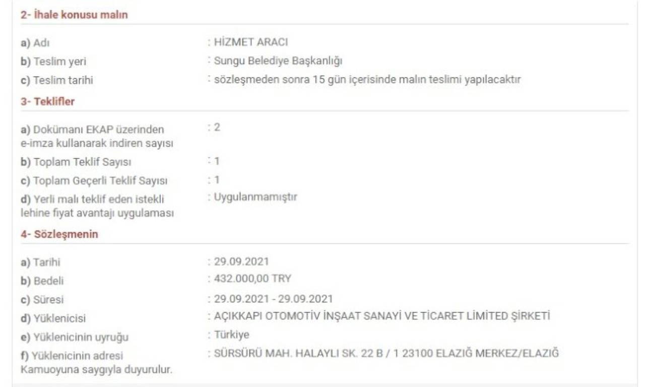 İhale sonucu 29 Eylül 2021'de sözleşme imzalandı. Alınan aracın maliyeti 432 bin TL. 10 bin nüfusu olan ilçeye aracı Elazığ'dan bir şirket getirdi.