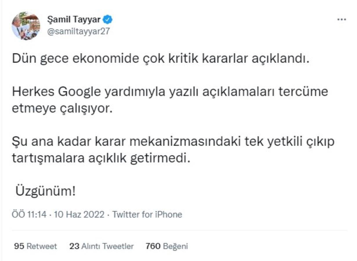 Tayyar eleştiriler yönelttiği açıklamasında,"Dün gece ekonomide çok kritik kararlar açıklandı. Herkes Google yardımıyla yazılı açıklamaları tercüme etmeye çalışıyor. Şu ana kadar karar mekanizmasındaki tek yetkili çıkıp tartışmalara açıklık getirmedi. Üzgünüm!" ifadelerini kullandı.