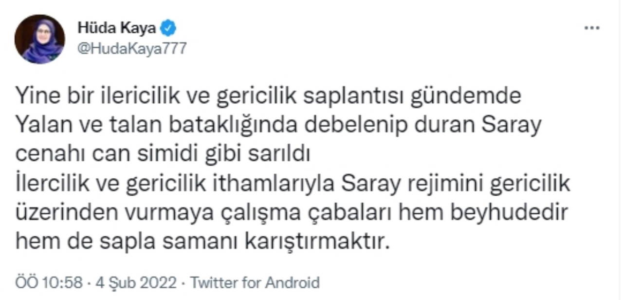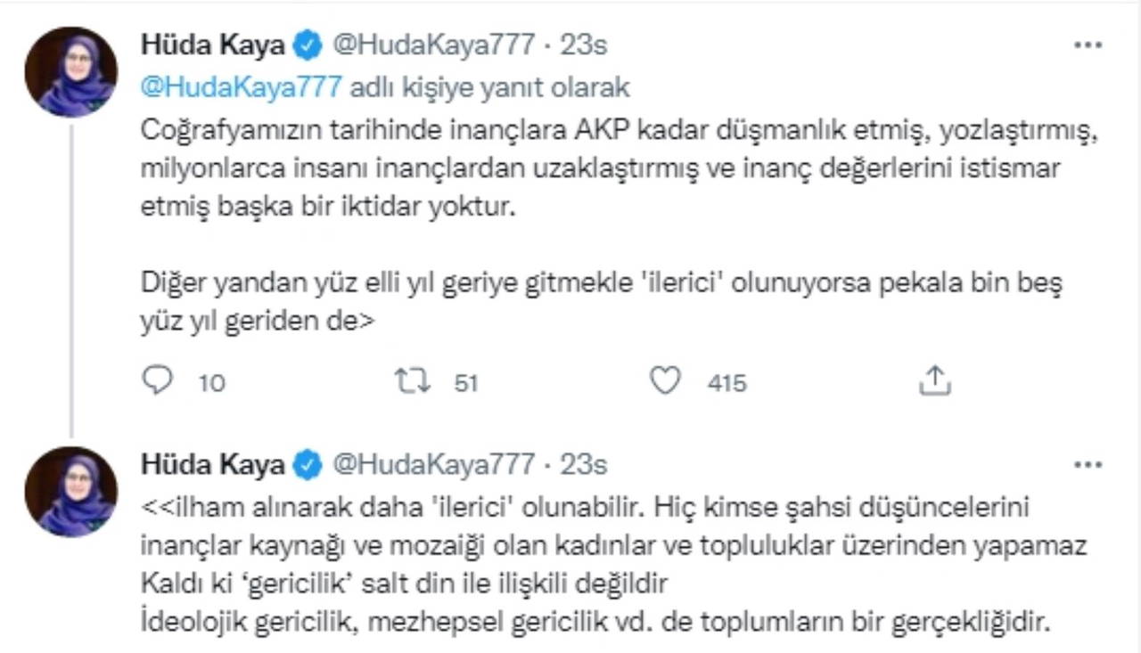 Hüda Kaya, "Coğrafyamızın tarihinde inançlara AKP kadar düşmanlık etmiş, yozlaştırmış, milyonlarca insanı inançlardan uzaklaştırmış ve inanç değerlerini istismar etmiş başka bir iktidar yoktur. Diğer yandan yüz elli yıl geriye gitmekle 'ilerici' olunuyorsa pekala bin beş yüz yıl geriden de ilham alınarak daha 'ilerici' olunabilir. Hiç kimse şahsi düşüncelerini inançlar kaynağı ve mozaiği olan kadınlar ve topluluklar üzerinden yapamaz. Kaldı ki ‘gericilik’ salt din ile ilişkili değildir İdeolojik gericilik, mezhepsel gericilik vd. de toplumların bir gerçekliğidir" değerlendirmesinde bulundu.