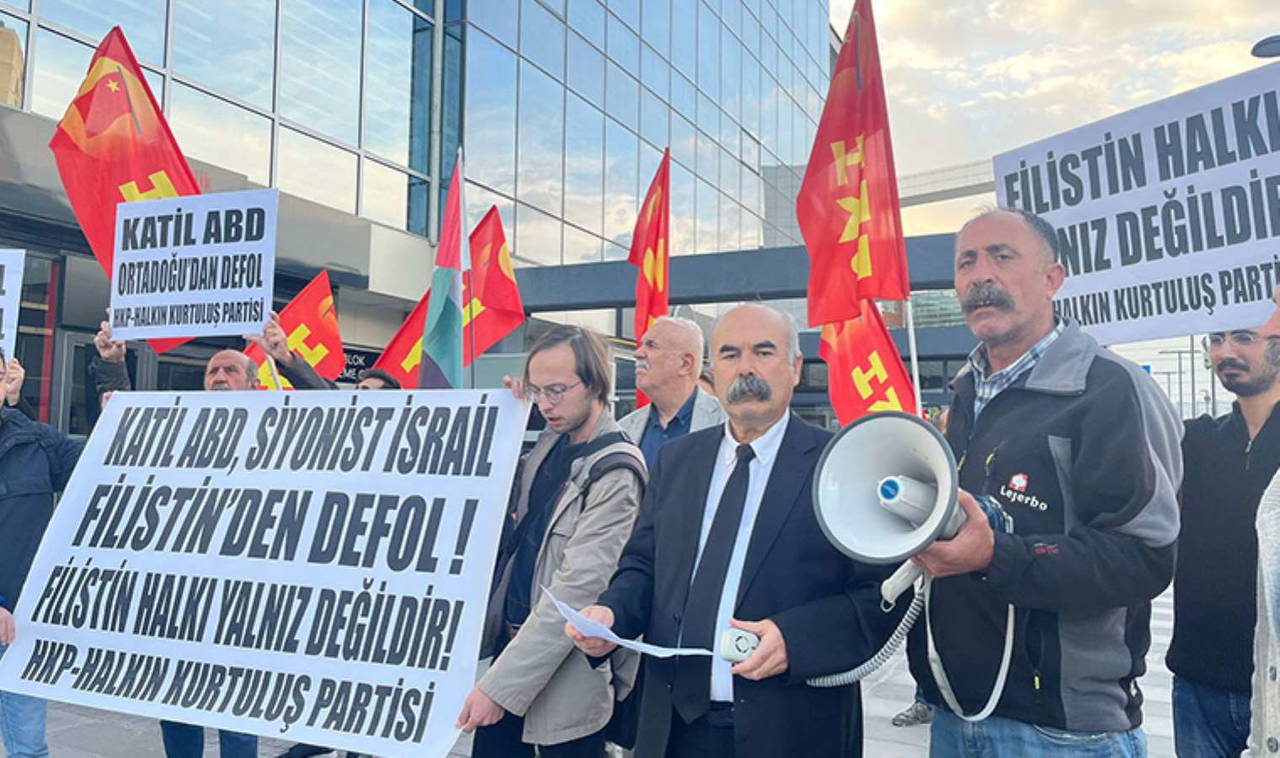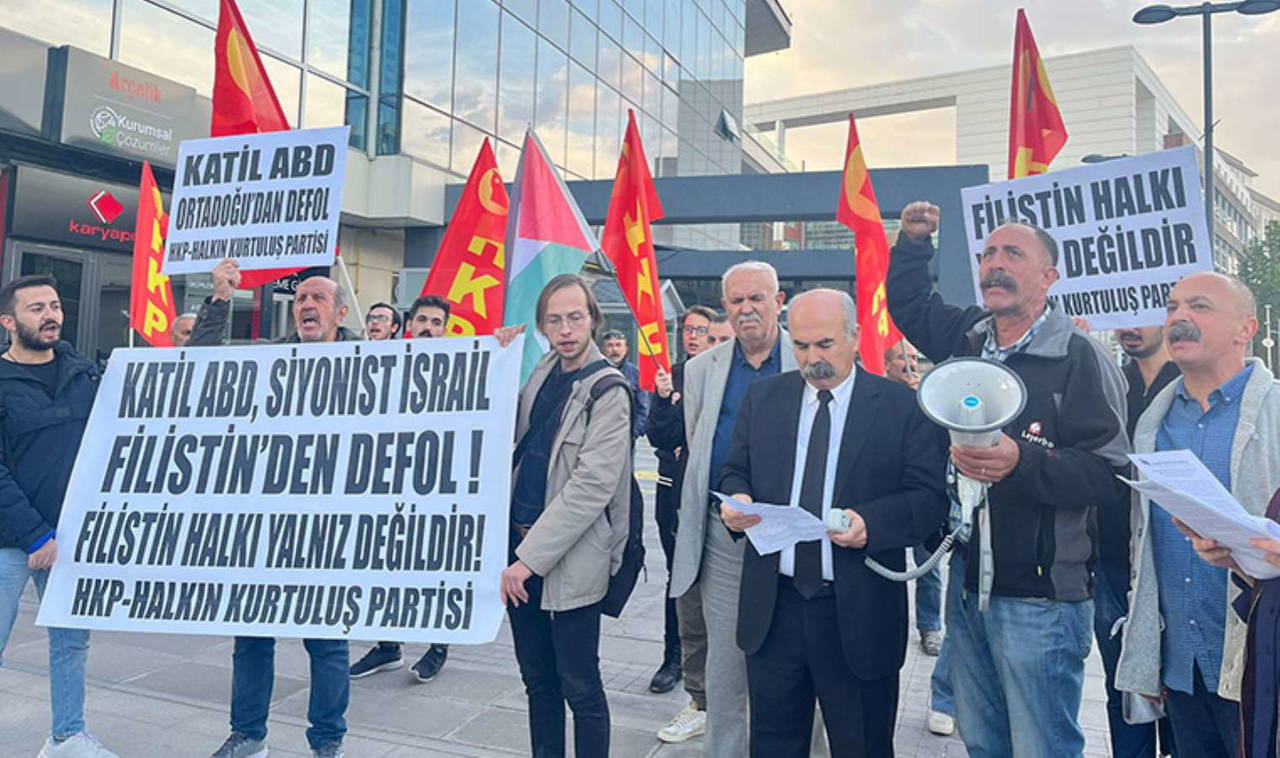 Burada konuşan HKP Genel Sekreter Yardımcısı Kıran, “Bu yapay devlet, 1948’den bugüne Arap halkını katletmeye devam ediyor. Kanlı zalim ABD emperyalist haydudunun müttefiki siyonist İsrail, bugün Gazze Şeridi’nde bütünüyle süpürme ve soykırım harekatına girişmiş durumda. Hiç durmadan savaş suçu işliyorlar” dedi.