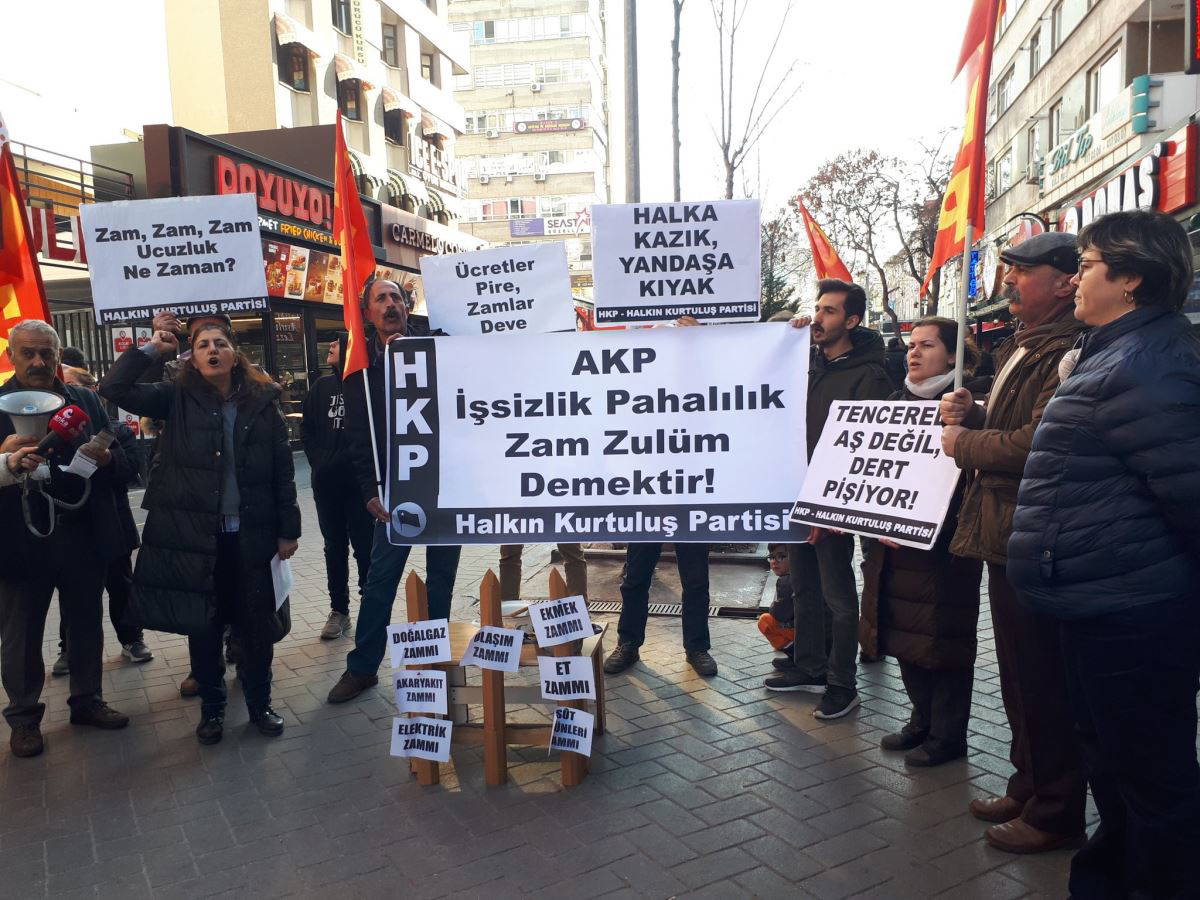 HKP üyeleri, AKP iktidarının ekonomi politikalarını bugün Ankara Kızılay’daki Karanfil Sokak’ta protesto etti. HKP üyeleri, “Halka kazık, yandaşa kıyak”, “Tencerede aş değil, dert pişiyor”, “Ücretler pire, zamlar deve”, “Zam, zam, zam ucuzluk ne zaman” yazılı dövizler taşıdı.