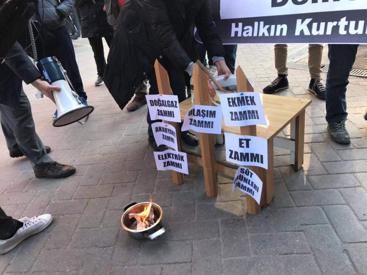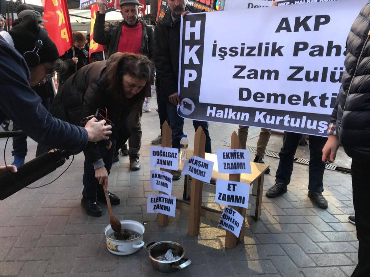 HKP'liler asgari ücrete, memur ve emekli maaşlarına yapılan zamlara tepki olarak boş tencerede fatura yaktı. HKP Ankara il yöneticisi Meliha Kuşçu, şunları söyledi: