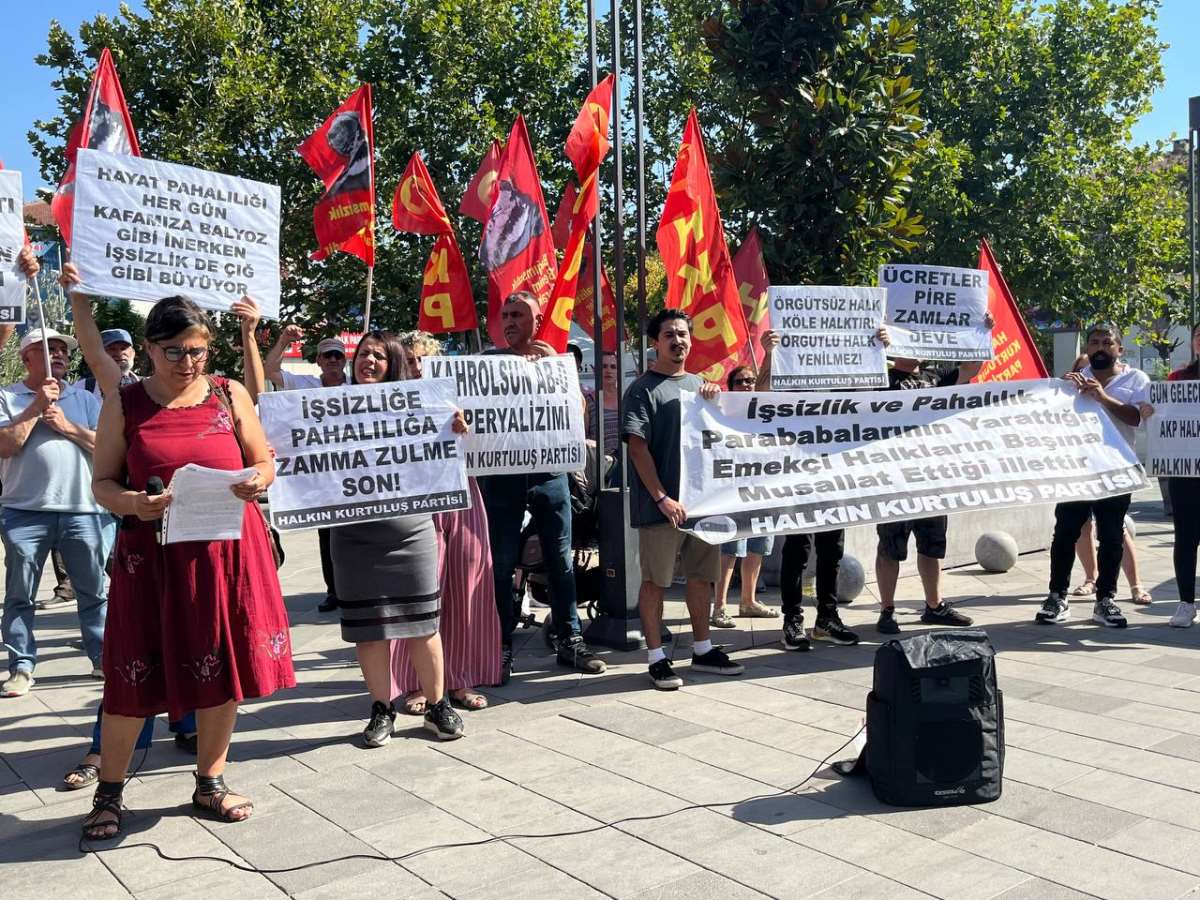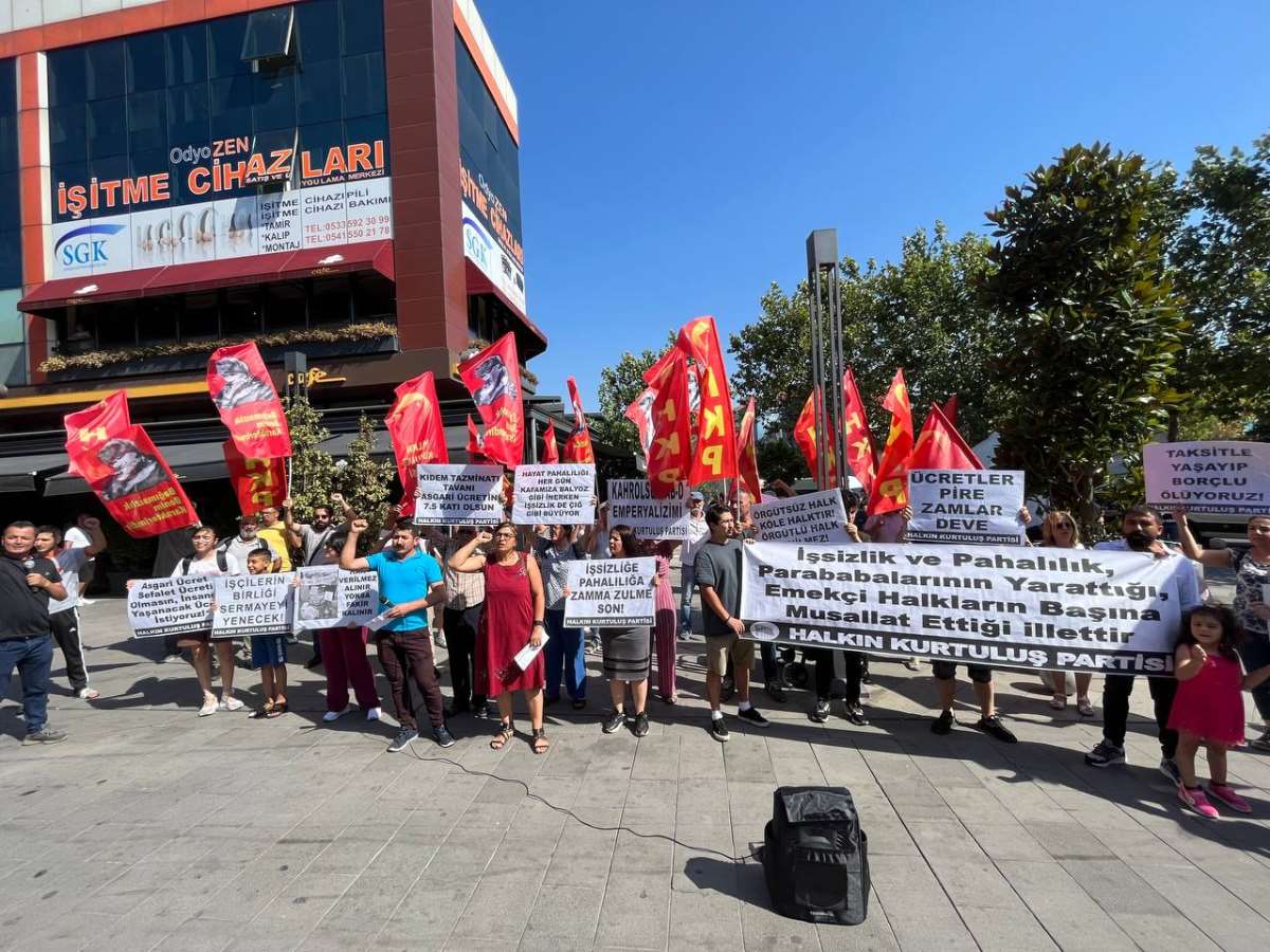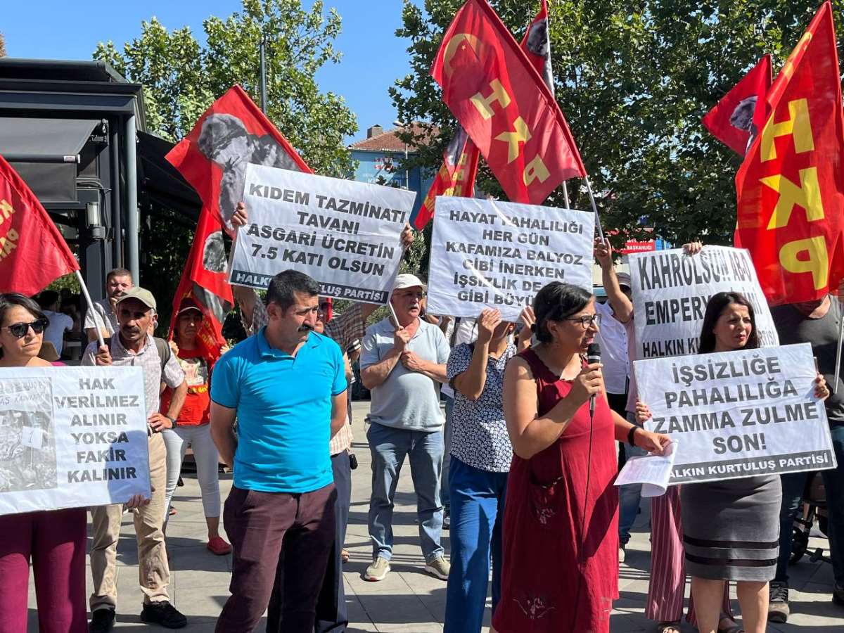 Basın açıklaması sırasında HKP üyeleri, “Evlerde yangın, sarayda saltanat”, “Zam, zam, zam ucuzluk ne zaman”, “AKP; işsizlik, pahalılık, zam, zulüm demektir”, “Tencerede aş değil, taş kaynıyor”, “Ücretler pire, zamlar deve”, “Taksitle yaşayıp borçlu ölüyoruz” sloganları attı.