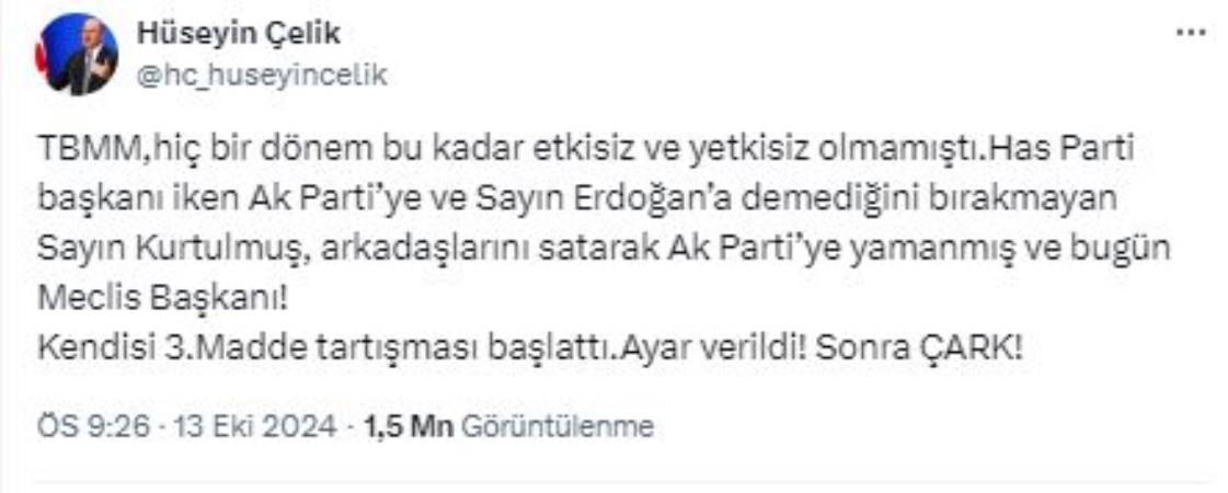 "TBMM, hiçbir dönem bu kadar etkisiz ve yetkisiz olmamıştı. Has Parti başkanı iken Ak Parti’ye ve Sayın Erdoğan’a demediğini bırakmayan Sayın Kurtulmuş, arkadaşlarını satarak Ak Parti’ye yamanmış ve bugün Meclis Başkanı! Kendisi 3. madde tartışması başlattı. Ayar verildi! Sonra çark!"