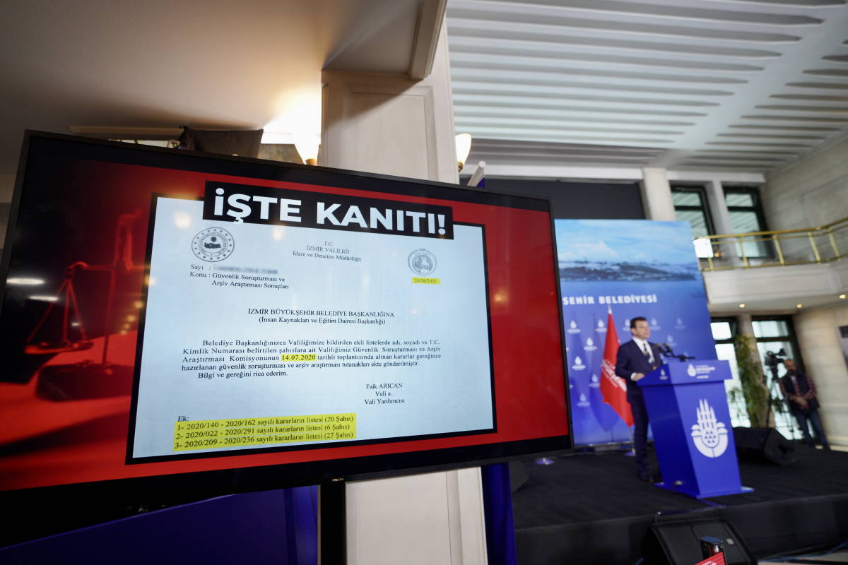 İmamoğlu konuşması sırasında ekrana İçişleri Bakanlığı’ndan İzmir Büyükşehir Belediyesi Başkanlığı’na yollanan belgeyi gösterdi. İçişleri Bakanı Süleyman Soylu’nun “terör örgütleri ile irtibatlı ve iltisaklı kişileri işten çıkarma yetkisi olmadığı”na ilişkin açıklamasını anımsatan İmamoğlu “Bakan işten çıkarılmalarına olur verip imzalıyor. Bakanın ‘Yetkimiz yok’ dediği iştirak şirketleri İzenerji ve İzelman’dan 15 işçi arşiv araştırmalarındaki olumsuzluk nedeniyle işten çıkarılıyor. Hani yetkiniz yoktu Bakan Bey? Bakanın görev ihmalini resmi belgeyle kanıtlamış durumdayız” ifadelerini kullandı.