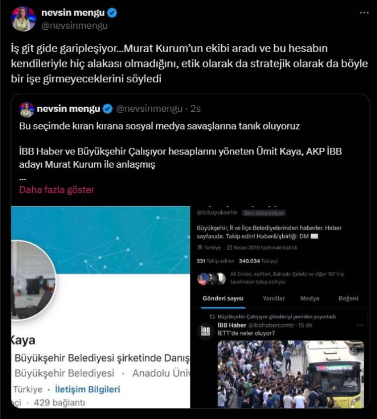 İlgili hesapların İmamoğlu aleyhine yaptığı paylaşımların görsellerini aktaran Mengü, "Bu seçimde kıran kırana sosyal medya savaşlarına tanık oluyoruz. İBB Haber ve Büyükşehir Çalışıyor hesaplarını yöneten Ümit Kaya, AKP İBB adayı Murat Kurum ile anlaşmış. Bu iki hesap İmamoğlu ile ilgili haberler paylaşıyordu. Ümit Kaya hali hazırda hala İBB çalışanı" dedi.