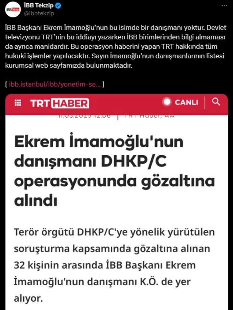 X'te İBB Tekzip hesabından yapılan paylaşımda, "İBB Başkanı Ekrem İmamoğlu’nun bu isimde bir danışmanı yoktur. Devlet televizyonu TRT’nin bu iddiayı yazarken İBB birimlerinden bilgi almaması da ayrıca manidardır. Bu operasyon haberini yapan TRT hakkında tüm hukuki işlemler yapılacaktır. Sayın İmamoğlu’nun danışmanlarının listesi kurumsal web sayfamızda bulunmaktadır" denildi.