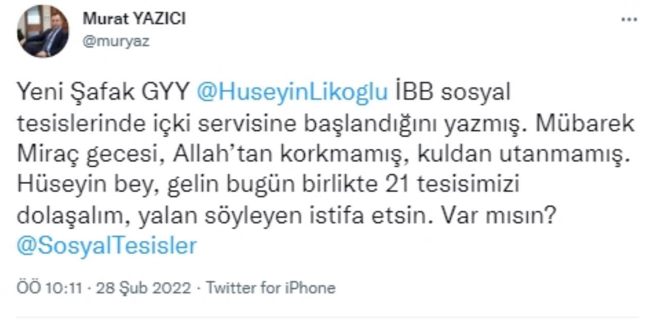 “Yeni Şafak Genel Yayın Yönetmeni Hüseyin Likoğlu, İBB sosyal tesislerinde içki servisine başlandığını yazmış. Mübarek Miraç gecesi, Allah’tan korkmamış, kuldan utanmamış. Hüseyin bey, gelin bugün birlikte 21 tesisimizi dolaşalım, yalan söyleyen istifa etsin. Var mısın?”