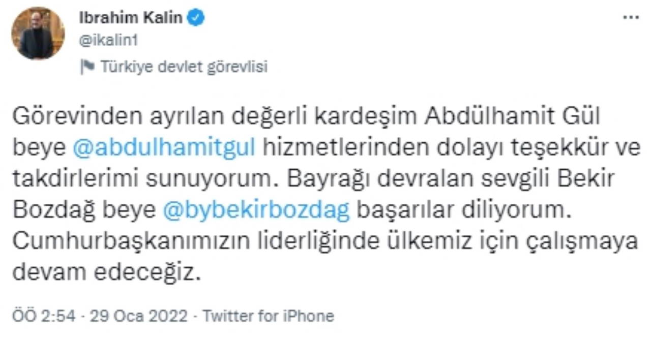 Cumhurbaşkanlığı Sözcüsü İbrahim Kalın da Twitter hesabından yaptığı paylaşımda, "Görevinden ayrılan değerli kardeşim Abdulhamit Gül Bey'e hizmetlerinden dolayı teşekkür ve takdirlerimi sunuyorum. Bayrağı devralan sevgili Bekir Bozdağ Bey'e başarılar diliyorum. Cumhurbaşkanımızın liderliğinde ülkemiz için çalışmaya devam edeceğiz" ifadelerini kaydetti.