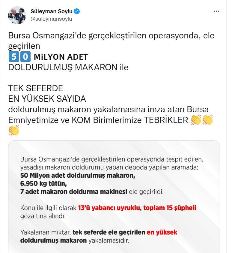 İçişleri Bakanı Süleyman Soylu da Twitter hesabından yaptığı açıklamada, "Bursa Osmangazi'de gerçekleştirilen operasyonda ele geçirilen 50 milyon doldurulmuş makaron ile tek seferde en yüksek sayıda doldurulmuş makaron yakalamasına imza atan Bursa emniyetimize ve KOM birimlerimize tebrikler" ifadelerine yer verdi.