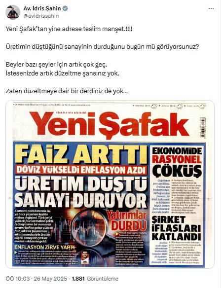 DEVA Partisi Genel Başkan Yardımcısı ve Ankara Milletvekili İdris Şahin, sosyal medya hesabından gazetenin manşet sayfasını paylaşarak şu ifadeleri kullandı: