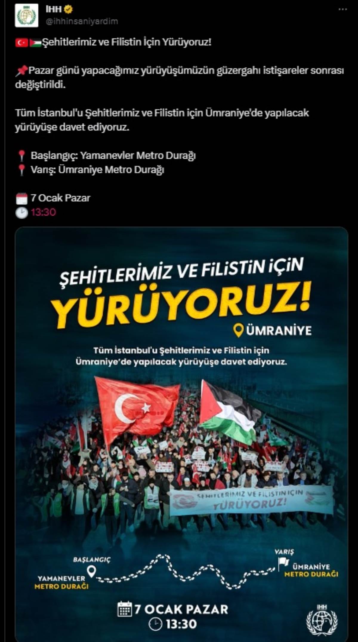 İHH’dan yapılan son açıklamada, yürüyüşün yerinin değiştirildiği ve yeni adresin Ümraniye olduğu duyuruldu.