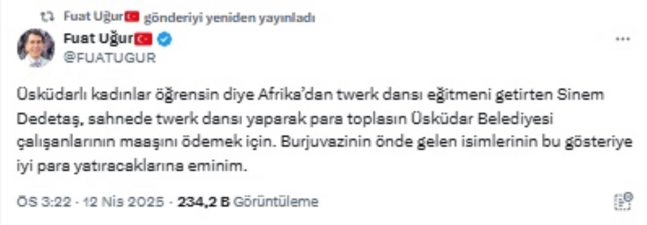 Gazeteci Uğur, Üsküdar Belediye Başkanı Sinem Dedetaş’ı hedef alarak yaptığı paylaşımda, "Üsküdarlı kadınlar öğrensin diye Afrika’dan twerk dansı eğitmeni getirten Sinem Dedetaş, sahnede twerk dansı yaparak para toplasın Üsküdar Belediyesi çalışanlarının maaşını ödemek için. Burjuvazinin önde gelen isimlerinin bu gösteriye iyi para yatıracaklarına eminim" ifadelerini kullandı.