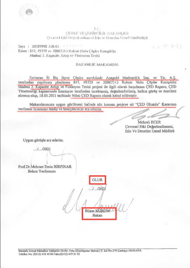 Raporda 2021 yılındaki Çevresel Etki Değerlendirme (ÇED) olumlu kararını veren yetkililerin de asli kusurlu bulunması dikkat çekti. Bilirkişi raporu ile gözler madenin kapasite artışına dair verilen ÇED olumlu kararında imzası bulunduğu, 2. kapasite artışı iznini verdiği ortaya çıkan dönemin Çevre ve Şehircilik Bakanı Murat Kurum’a çevrildi.