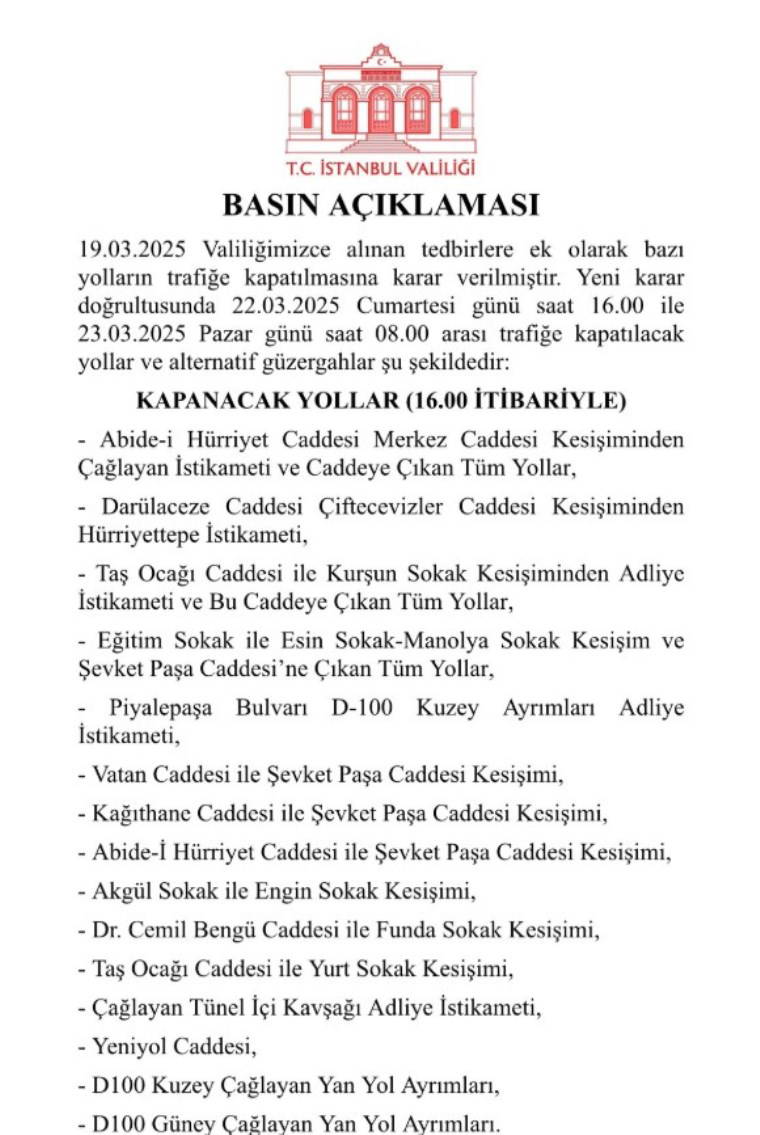 İstanbul Valiliği, İstanbul Büyükşehir Belediye Başkanı Ekrem İmamoğlu'nun ifade vereceği Çağlayan Adliyesi'nin çevresindeki yolların trafiğe kapatıldığını duyurdu.