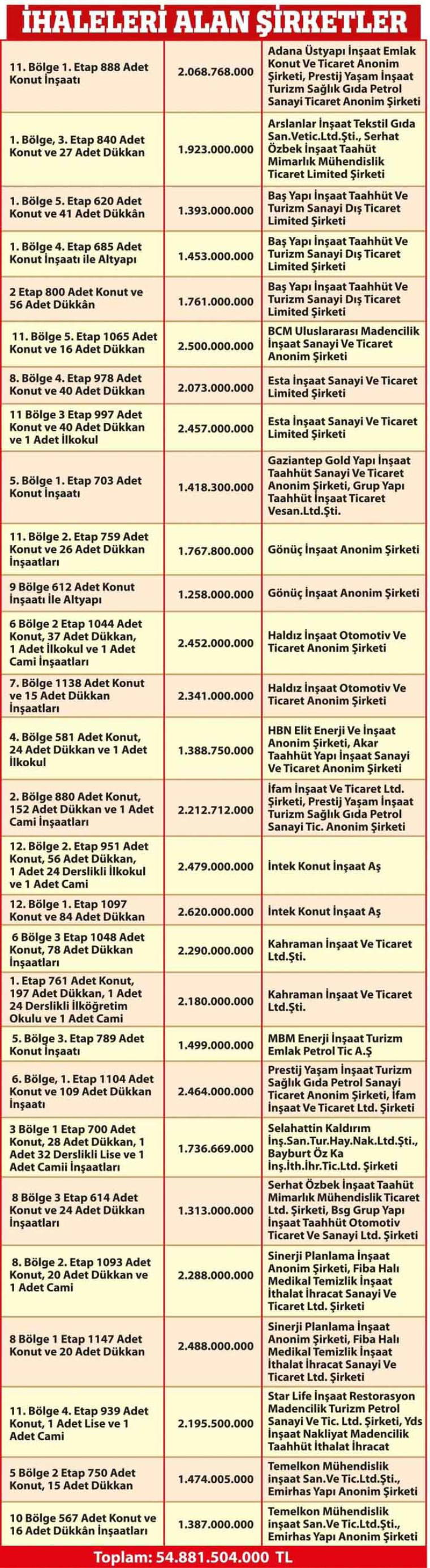 Prestij İnşaat ve ortakları 6 milyar 745 milyon TL’lik ihale alırken, Serhat Özbek İnşaat ortaklarıyla birlikte 3 milyar 236 milyon TL’lik sözleşme imzaladı.