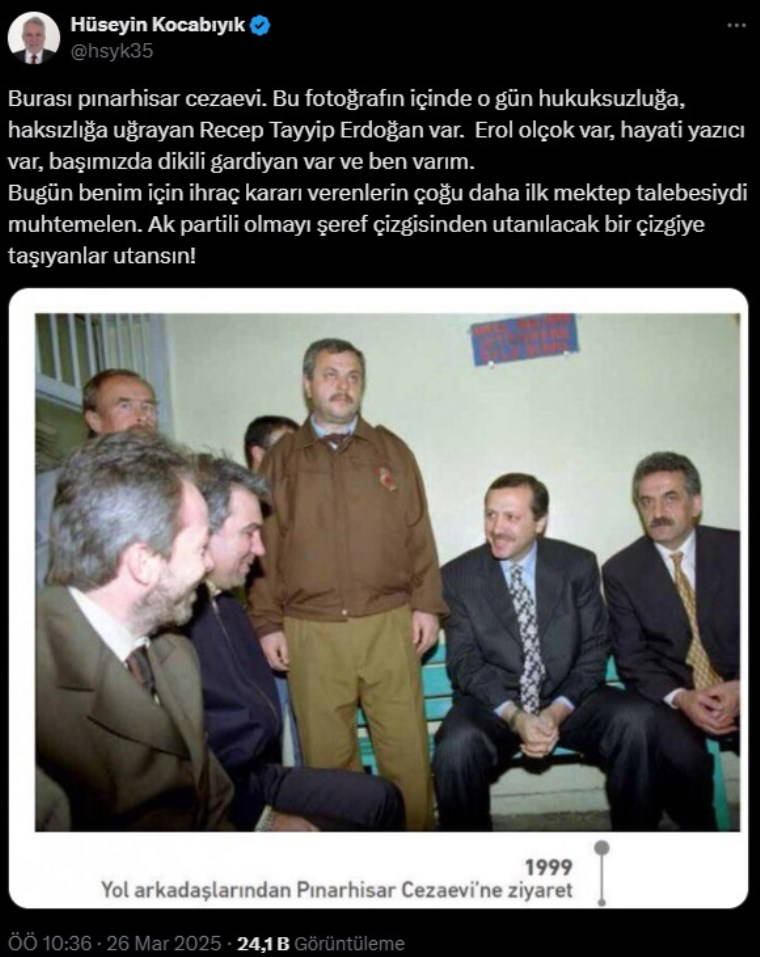 “Burası Pınarhisar Cezaevi. Bu fotoğrafın içinde o gün hukuksuzluğa, haksızlığa uğrayan Recep Tayyip Erdoğan var. Erol Olçok var, Hayati Yazıcı var, başımızda dikili gardiyan var ve ben varım. Bugün benim için ihraç kararı verenlerin çoğu daha ilk mektep talebesiydi muhtemelen. AK Partili olmayı şeref çizgisinden utanılacak bir çizgiye taşıyanlar utansın!"