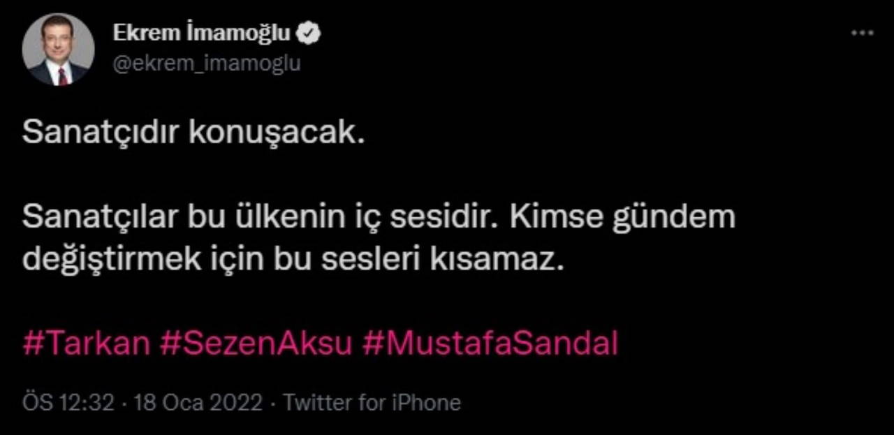 İstanbul Büyükşehir Belediye (İBB) Başkanı Ekrem İmamoğlu, yakın zamanda iktidara yakın medya organları, AKP'ye yakın isim ve gruplar tarafından sistematik olarak hedef gösterilen sanatçılara destek verdi. Twitter hesabından bir paylaşımda bulunan İmamoğlu; 2017 yılında çıkardığı 'Şahane Bir Şey Yaşamak' şarkısı üzerinden eleştirilen Sezen Aksu'ya, akabinde Aksu'ya destek veren Mustafa Sandal'a ve toplumsal olaylara eleştirel paylaşımları sebebiyle hedef alınan Tarkan'a atıfta bulundu.