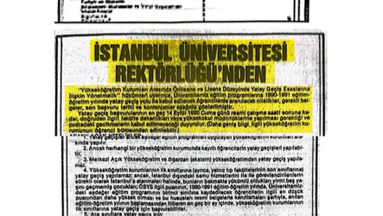 "Başvurular üzerine fakültede yatay geçiş komisyonu kuruluyor. Yatay geçiş komisyonu, geçişin kabulünü yönetim kuruluna öneriyor. 12 Eyül 1990'da İstanbul Üniversitesi Yönetim kurulu toplşanıyor ve aralarında Sayın İmamoğlu'nun da bulunduğu yatay geçişler onaylanıyor ve resmiyet kazanıyor. Komisyonun önerisi üzerine kabulü 51 kişi için yönetim kurulu veriyor. İmamoğlu 2 Ekim 1990'da İstanbul Üniversitesi İngilizce İşletme bölümüne kayıt oluyor ve 2. sınıf talebesi olarak başlıyor."