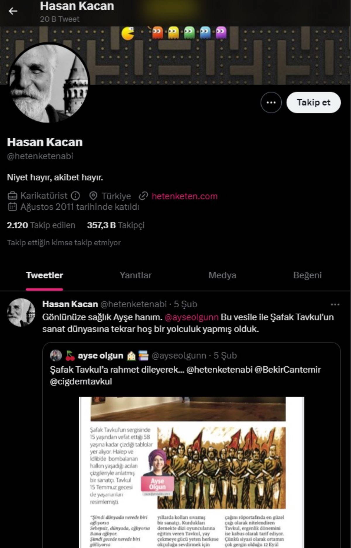 Kaçan'ın Twitter hesabında en son 5 Şubat'ta yaptığı paylaşım yer alıyor.