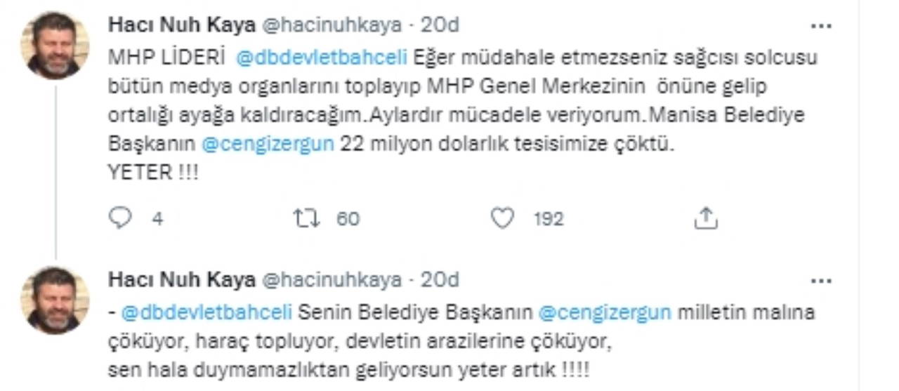 "MHP lideri Devlet Bahçeli, eğer müdahale etmezseniz sağcısı solcusu bütün medya organlarını toplayıp MHP Genel Merkezi'nin önüne gelip ortalığı ayağa kaldıracağım. Aylardır mücadele veriyorum. Manisa Belediye Başkanın Cengiz Ergün 22 milyon dolarlık tesisimize çöktü. Yeter!!!"