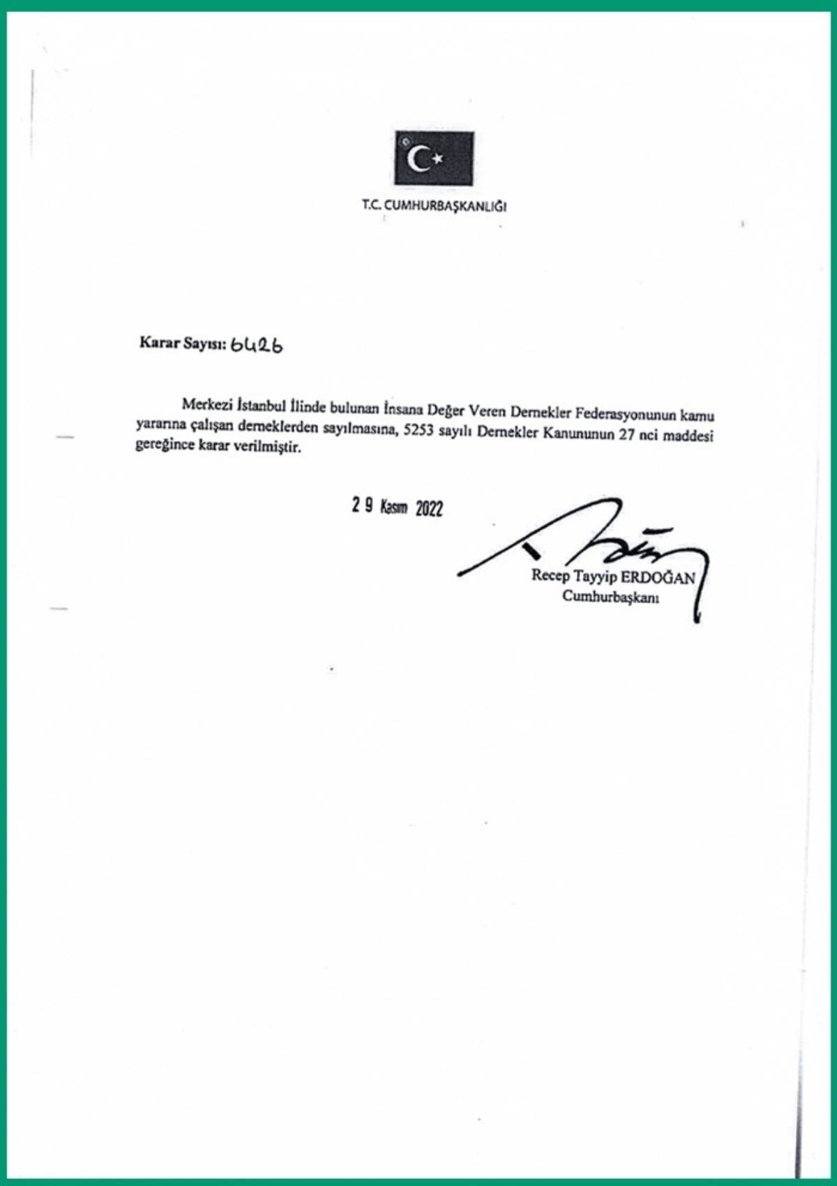 Tartışmalı listeye, cemaat bağlantılı bir derneğin daha eklendiği ortaya çıktı. Kendisini “İsmailağa cemaatinin yurtdışı hizmet birimi” olarak tanıtan İDDEF’e, 29 Kasım 2022’de, Cumhurbaşkanı Recep Tayyip Erdoğan’ın imzasıyla “kamu yararına çalışan dernek” statüsü verildi.