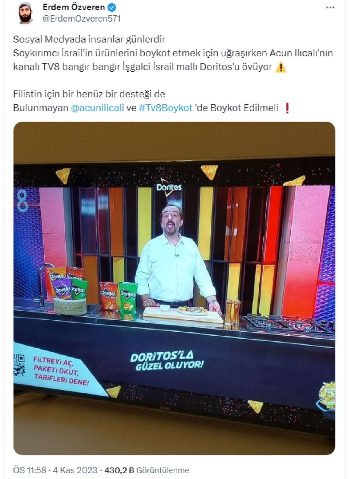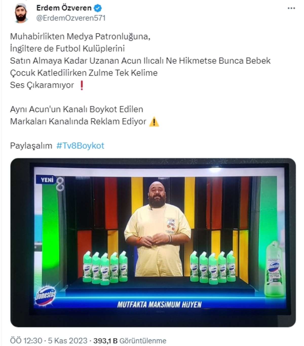 Özveren bu paylaşımında da TV 8'e boykot çağrısını "Sosyal medyada insanlar günlerdir soykırımcı İsrail'in ürünlerini boykot etmek için uğraşırken Acun Ilıcalı'nın kanalı TV8 bangır bangır İşgalci İsrail mallı Doritos'u övüyor! Filistin için bir henüz bir desteği de bulunmayan Acun Ilıcalı ve TV 8 boykot edilmeli!" diyerek dile getirdi.