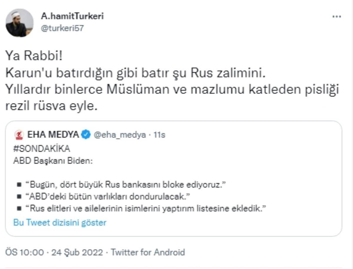 Cemaatin 'fıkıh kurulu üyesi' Abdulhamid Türkeri, Twitter hesabından ABD Başkanı Joe Biden'ın Rusya'ya yönelik yaptırımlarını bildiren bir haberi alıntıladığı paylaşımında Moskova yönetimi için şu ifadeleri kullandı: