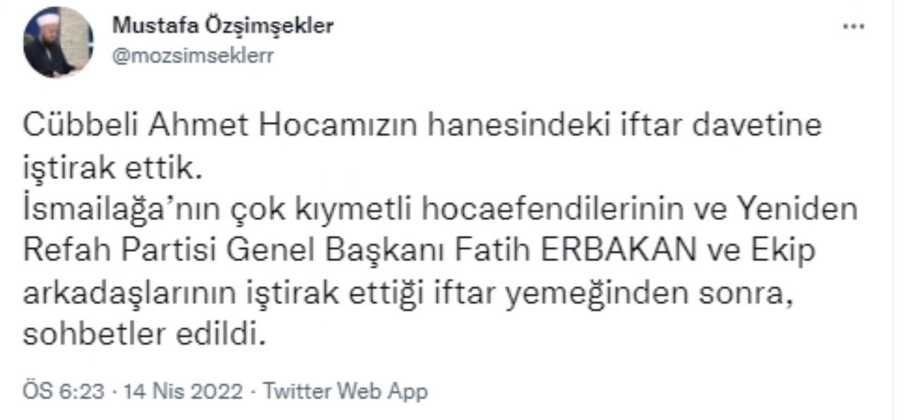 Erbakan ve beraberindeki parti heyetinin isimlerin de yer aldığı iftar buluşmasının fotoğrafı, cemaatin önde gelen isimlerinden Mustafa Özşimşekler'in sosyal medya hesaplarından paylaşıldı.