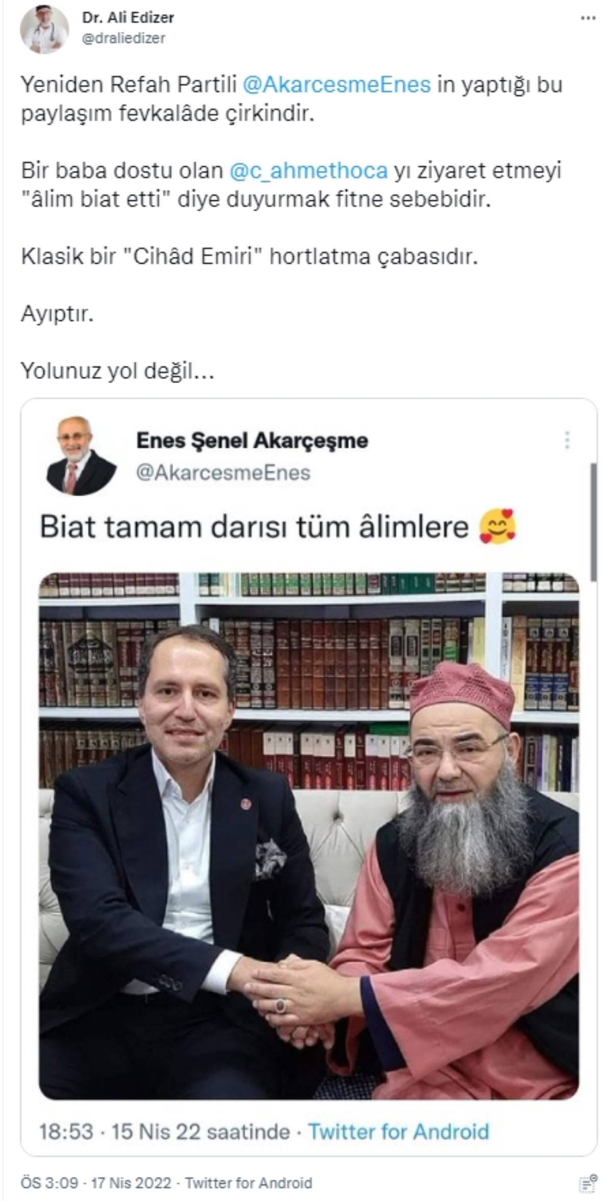 Enes Akarçeşme'nin paylaşımına iktidarın bir başka sıkı destekçisi dinsel yapılanmadan, Menzil cemaatinden tepki geldi. Menzil cemaatinin sosyal medyadaki önde gelen isimlerinden biri olan ve medeni hukuk ve laikliği hedef alan açıklamaları nedeniyle tepki çeken Doktor Ali Edizer, paylaşımın 'fitne sebebi' olduğunu söyledi. Edizer, Akarçeşme'ye "Ayıptır. Yolunuz yol değil..." diyerek tepki gösterdi.