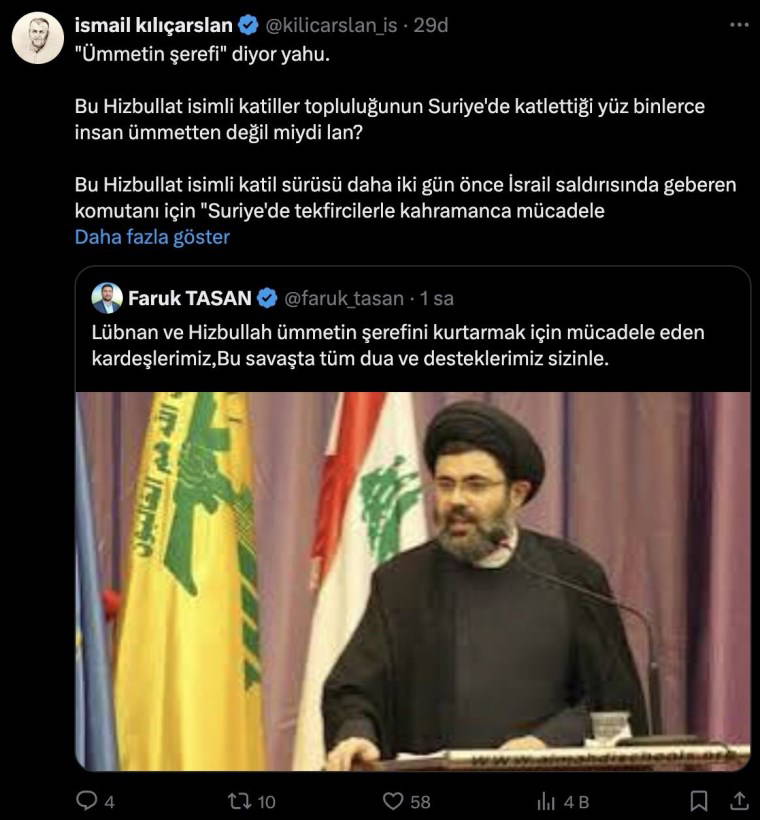 "Hizbullah, kafir adına Müslüman katleden bir cehennem köpeğidir. Müslüman bir ülkede bu cehennem köpeklerinin propagandasının yapılması, sıradan bir gaflet değil, bütün Müslümanların canlarının ve namuslarının tehdit edilmesi anlamına gelir."