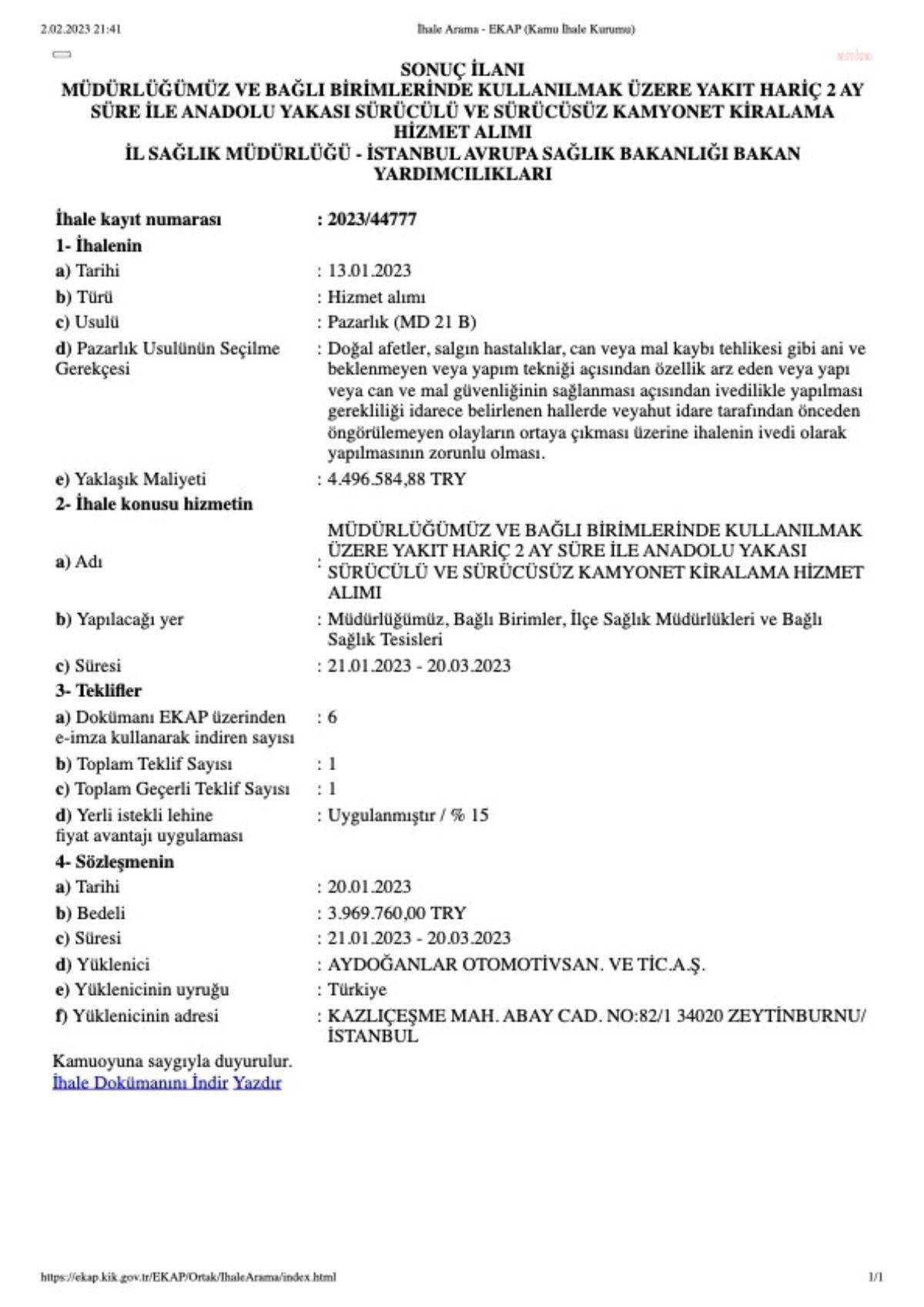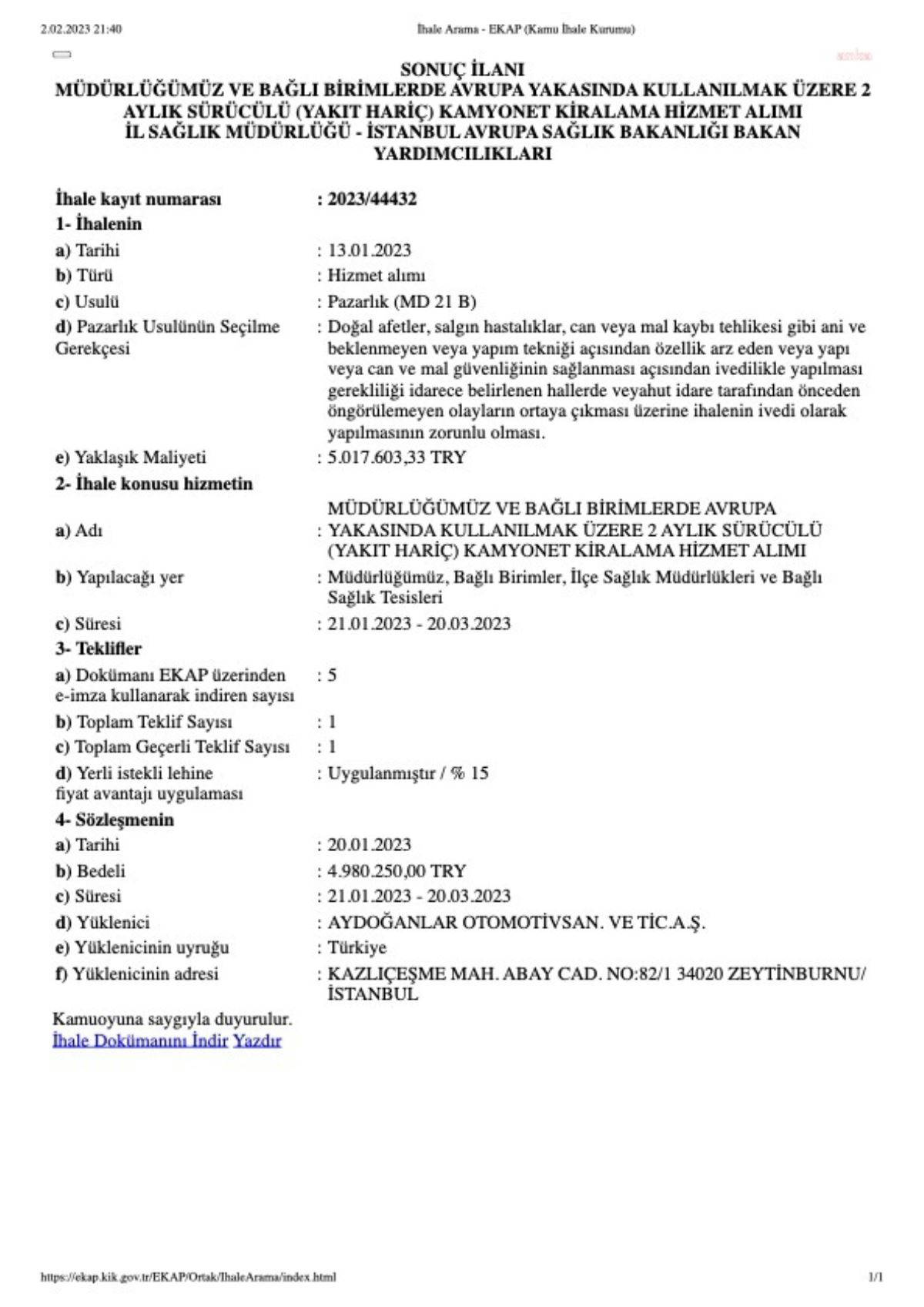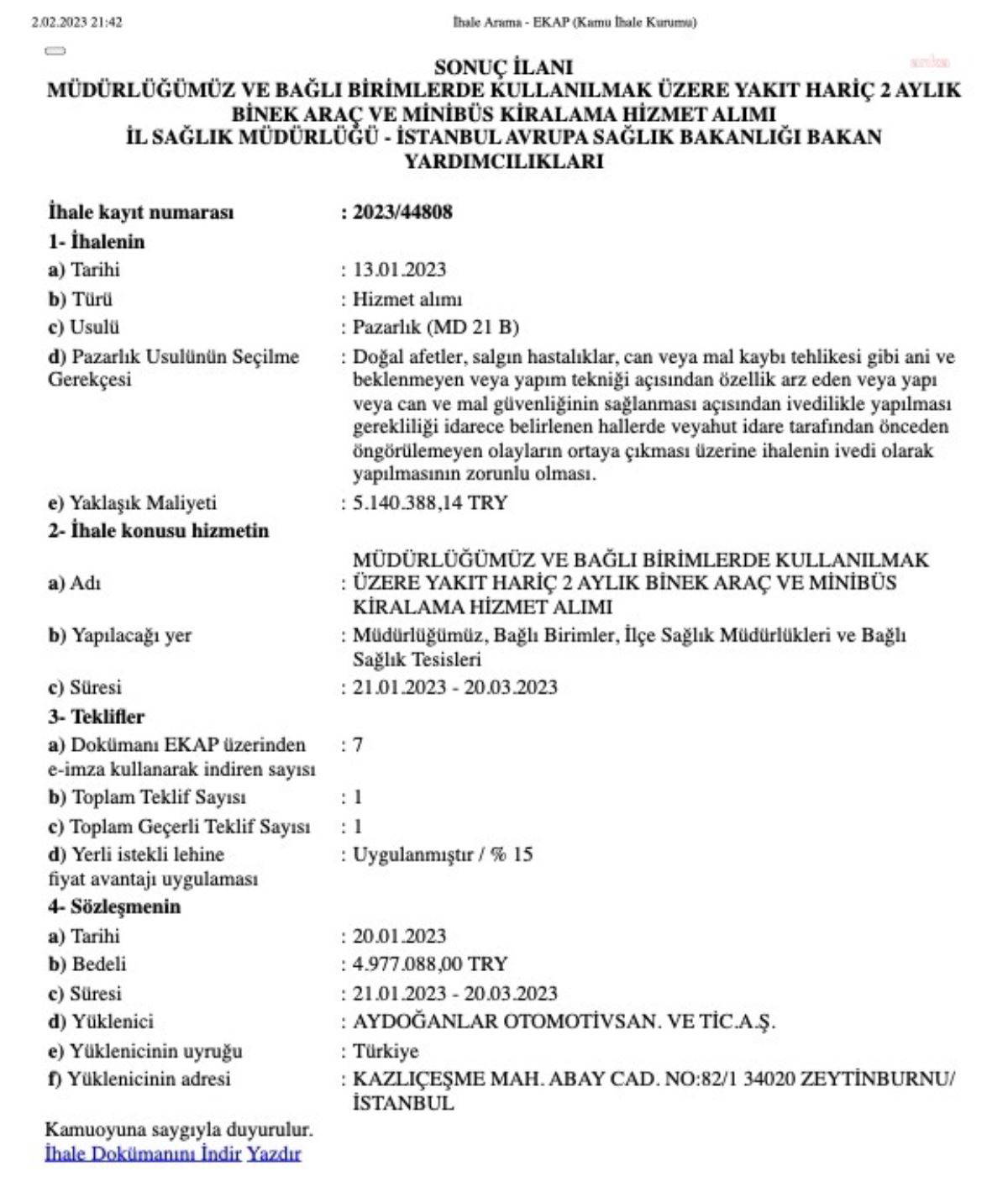 ANKA Haber Ajansı'ndan Güney Ülger'in haberine göre, ilk ihale, 13 Ocak’ta saat 15.30’da yapıldı. İstanbul İl Sağlık Müdürlüğü ve bağlı birimlerde Avrupa Yakası’nda kullanılmak üzere iki ay süreyle sürücülü kamyonet kiralama hizmeti için açılan ihaleyi, 4 milyon 980 bin 250 TL sözleşme bedeli ile Aydoğanlar Otomotiv kazandı.