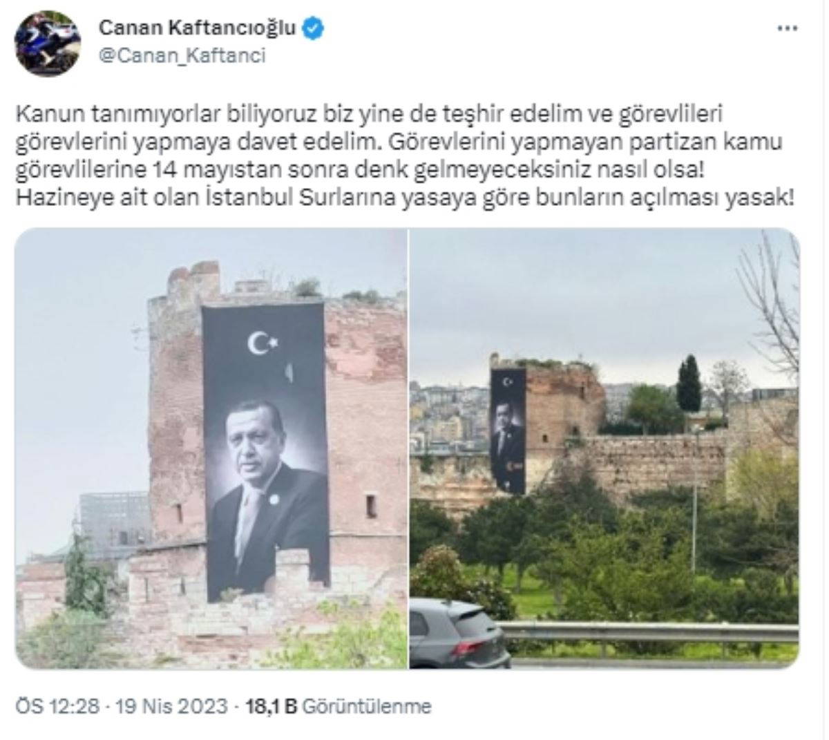 CHP İstanbul İl Başkanı Canan Kaftancıoğlu, AKP'nin seçim sloganı olan "Türkiye Yüzyılı" yazılı posterin surlara asılı halde fotoğraflarını sosyal medya hesabından paylaşıp şu ifadeleri kullandı: