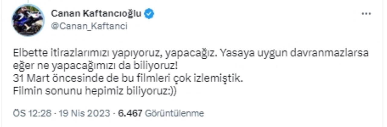 Canan Kaftancıoğlu, uygulama üzerine itirazda bulunacaklarını duyururken "Yasaya uygun davranmazlarsa eğer ne yapacağımızı da biliyoruz! 31 Mart öncesinde de bu filmleri çok izlemiştik. Filmin sonunu hepimiz biliyoruz:))" ifadelerini kullandı.